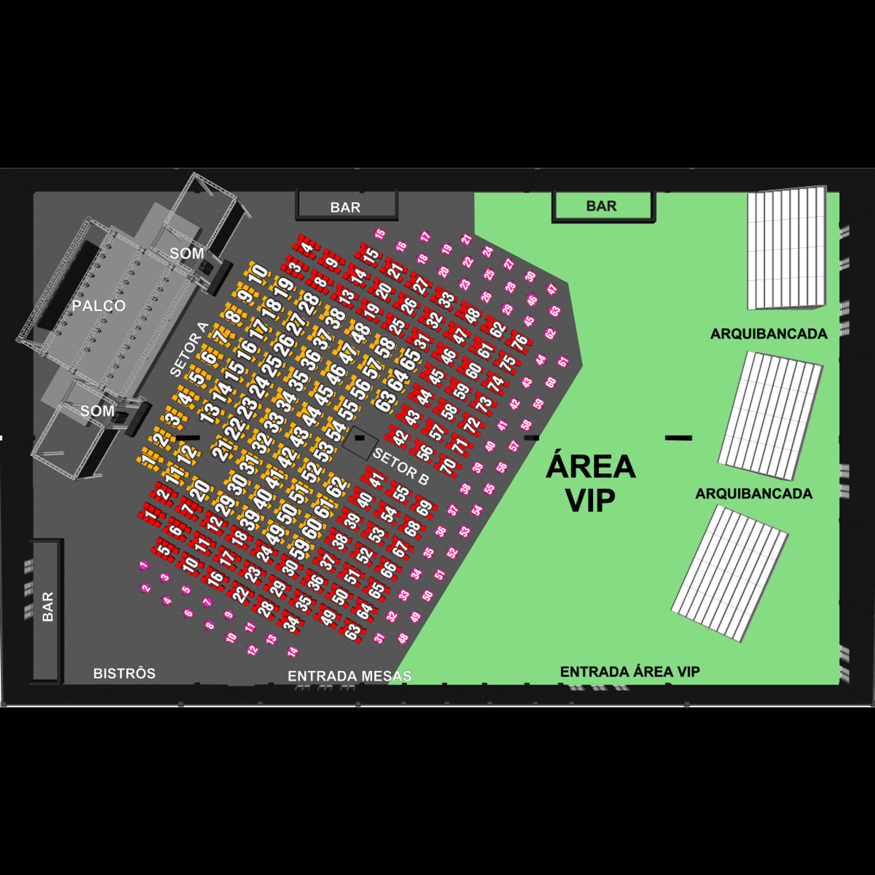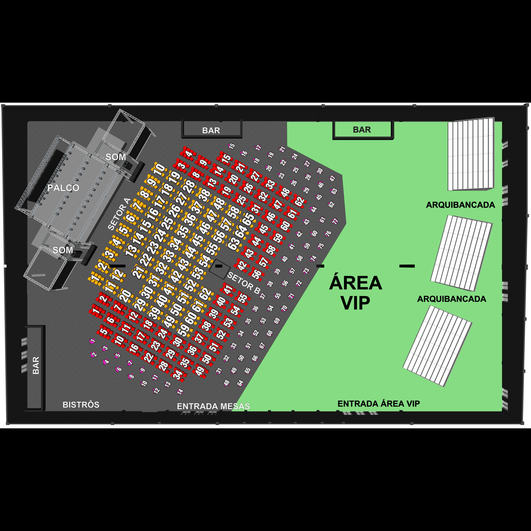 Usando o mapa como referência, escolha o setor desejado. Na próxima etapa você poderá selecionar a quantidade de lugares. Atente para o fato de que os setores podem possuir preços diferentes.